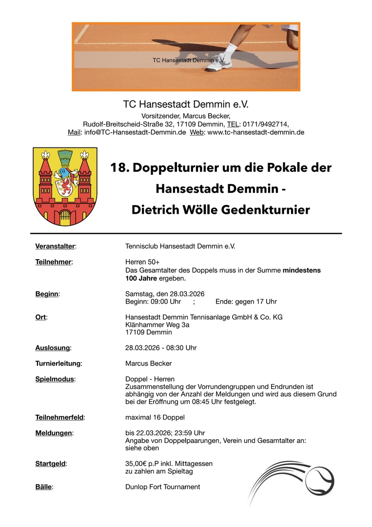 Der Tennisverein lädt zu den Clubmeisterschaften für Kinder und Jugendliche ein ein. Ermittelt werden die besten Clubspieler. Gäste und Zuschauer, sind recht herzlich in der Tennisanlage Demmin im Klänhammerweg 3 willkommen.
